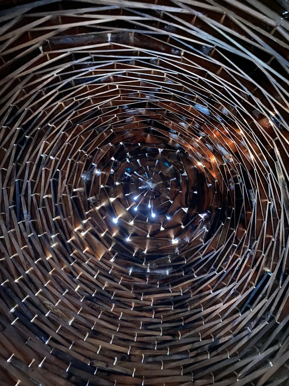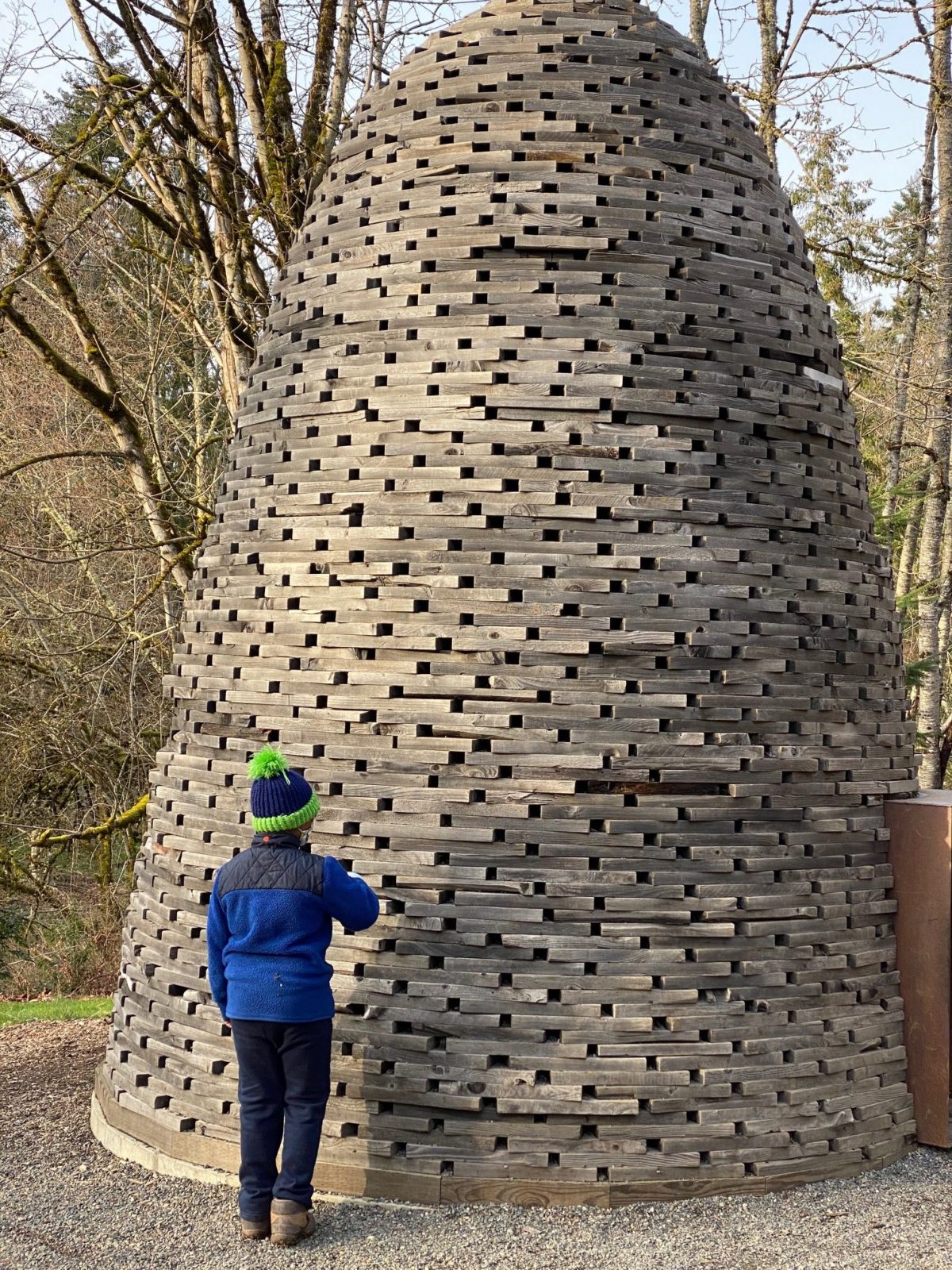 The trail is a 1/3-mile loop through ten acres of woodlands, meadows and wetlands. We spot birds and squirrels, balance our way back and forth on moss-covered stone garden hedges, and see many sculptures. There are many favorite sculptures ā one in particular is “Night Blooming,” a structure resembling a beehive with an opening so visitors can check out the inside. My kids pretend to be bees and buzz ourselves into the sculpture and find the afternoon light passing through the tiny gaps, creating a remarkable image. We stay a while, sitting on the ground, just looking up.