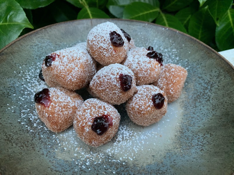 - When the doughnuts have cooled slightly, make a small hole in each with a sharp knife. Fill your plastic bag with the jam or jelly, close it tight (twisting the top of the bag to get out all the air), and snip off a small piece of the plastic. Poke the tip of the bag into each doughnut and fill each completely. Roll the doughnuts in powdered sugar and serve!