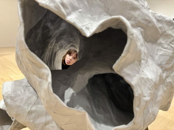 Together with one of the Henry’s knowledgeable museum attendants, we concluded that these specimens were journeying toward McMillian’s monumental, 40-ft painting, “44.8617 N by 93.5606 W Coordinates to an ascension (2018).” To Cora’s delight, the huge landscape depicted a world more beautiful — but equally as alien — as the Upside Down from “Stranger Things”. Cora also loved the similarly “ghostly and witchy” video work “untitled (neighbors) (2017)”, in which figures clad in eerie white robes danced and shook their bodies in the darkness.